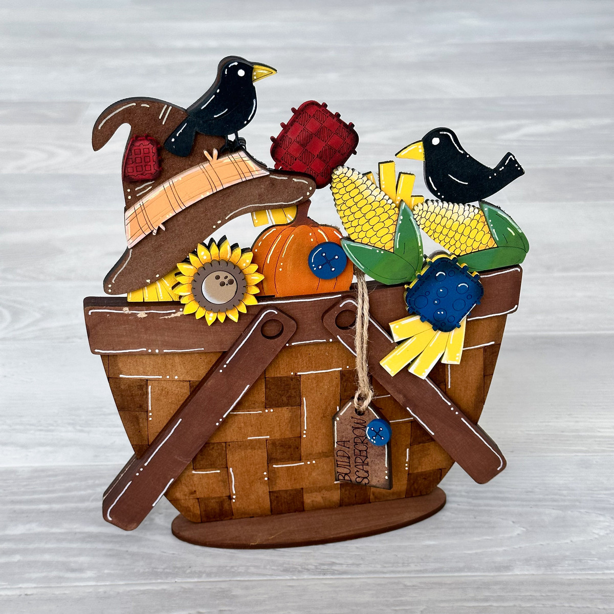 add a whimsical touch of fall with this scarecrow insert for the flowerbasket
