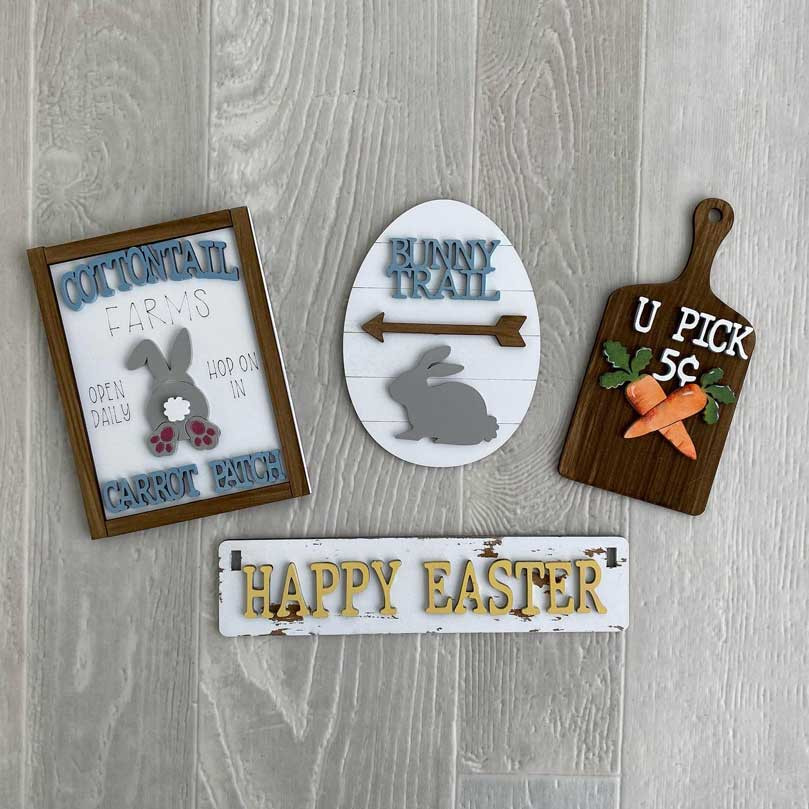 Easter bunnies make great decor in your home. This cute 4 piece set will take you right down the bunny trail. Perfect for the wagon, crate or raised shelf containers.